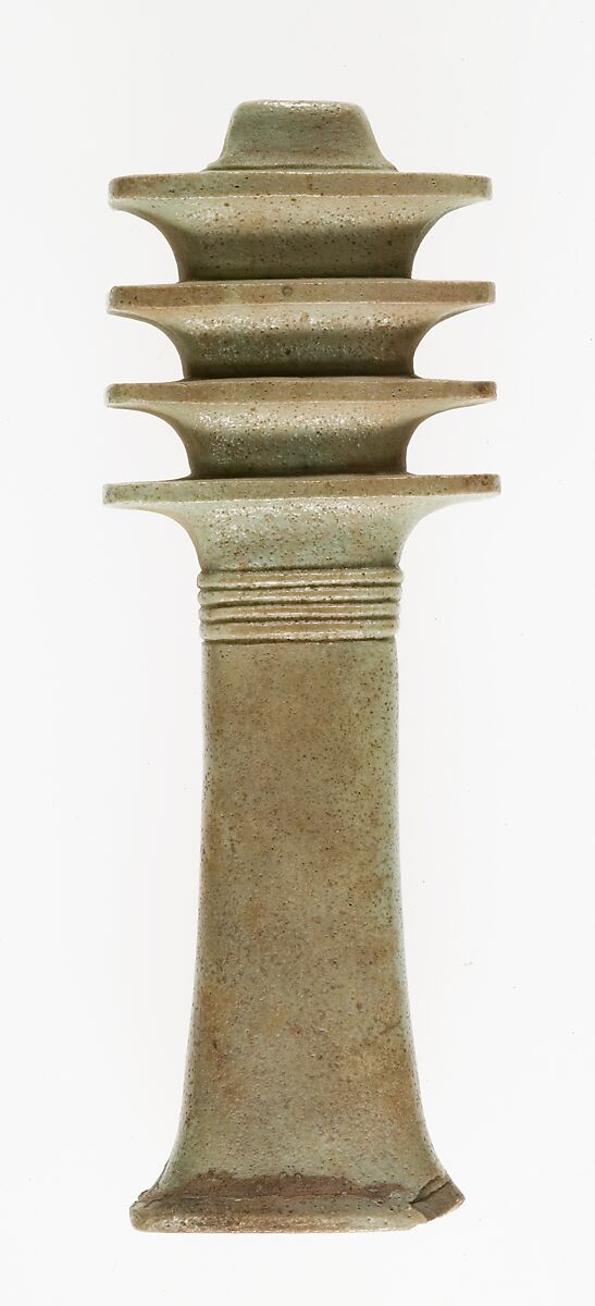 The djed-pillar is a stylized representation of an early fetish that probably consisted of plant material. From the beginning of ancient Egyptian history, it was used as a symbol signifying permanence. Later it was associated with the god Osiris and identified as his backbone. The djed-pillar here was probably used as a funerary amulet to ensure permanence and to closely connect the deceased to Osiris, who was revived after death.