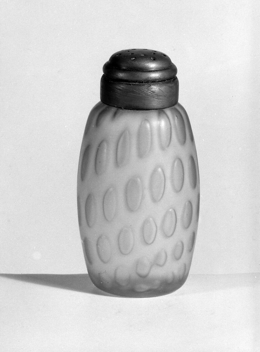 This satin-glass pepper caster is decorated with elongated oval dots and is similar to 46.140.271.