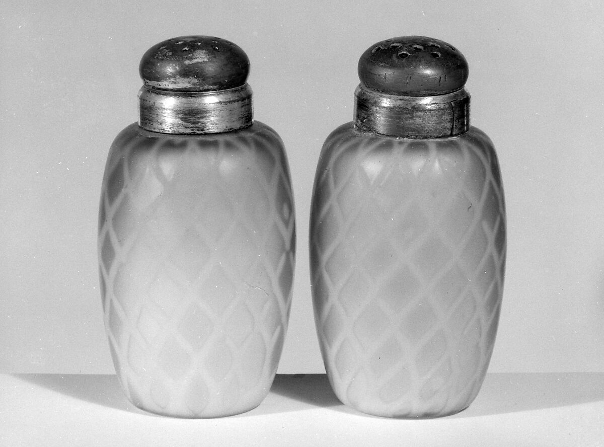 This satin-glass pepper caster is decorated with a diamond "air trap" pattern.