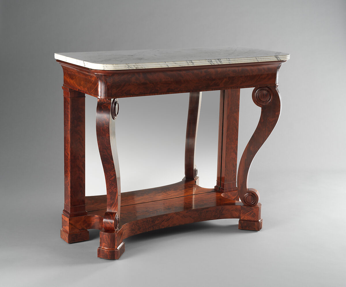 Designated for the pier wall between two windows, a pier table was considered an integral part of an elegant parlor. The mirror below the tabletop reflected light into the room, amplifying the soft glow of candle and fuel-based light sources. Two similar Phyfe pier tables are known: one, for which there is an 1834 bill of sale, is in the White House; the other, bearing the D. Phyfe & Sons label (1837–1840), was made for Phyfe's daughter Eliza Phyfe Vail (1801–1890). However, neither of those examples have scroll supports placed at a 45 degree angle to the table's top as seen here. The other two documented tables have scroll supports and bases that face straight out. This table carefully follows the design illustrated in Plate 631 of volume three of Pierre de La Mésangère's Collection de Meubles et Objets de Goût.