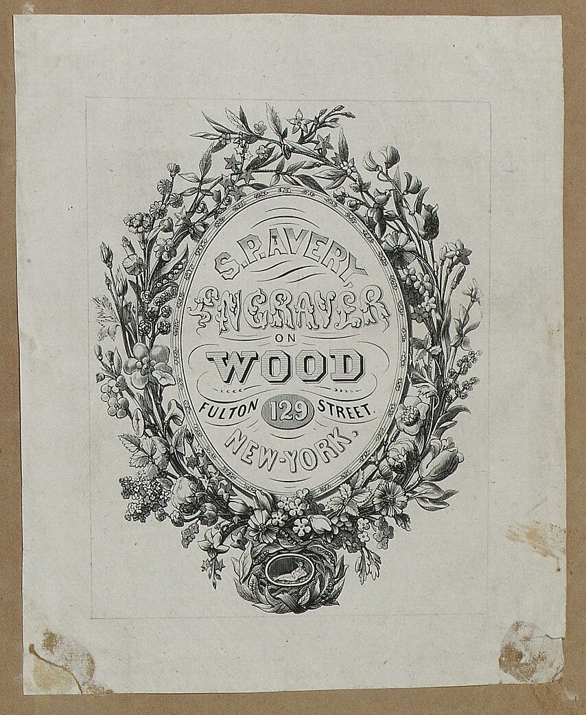 Illustrated: engraving of Samuel P. Avery's trade card listing his location as "S. P. Avery, Engraver on Wood, 129 Fulton St. NY, NY"