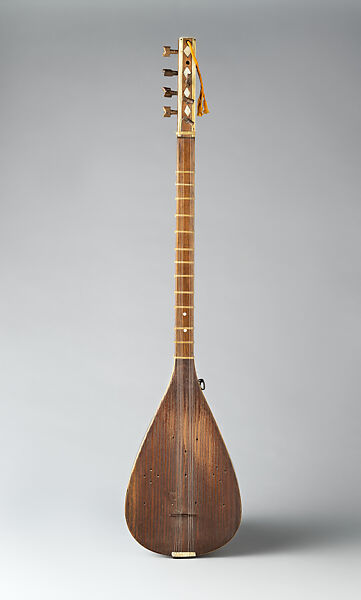 This work of art is currently on loan to the museum.Primarily a folk instrument played by Azeri ashiqs, bards who perform lyric poems, the çoğur is used for narrative ballads and instrumental pieces often accompanied by drums. The number of strings on a çoğur varies, with up to nine arranged in three courses of three strings each. This instrument, found mainly in western Azerbaijan, has two courses of two strings and one of three.