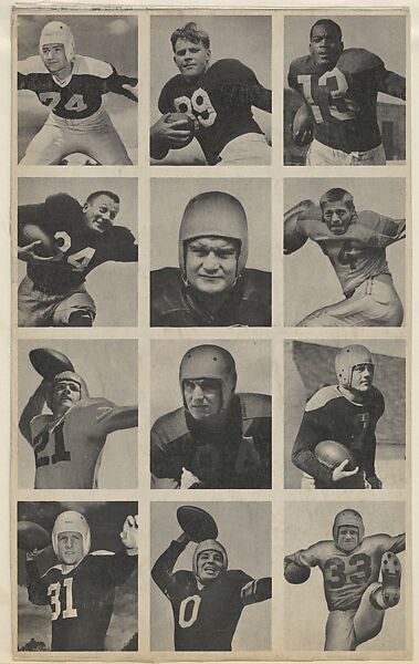 Trade cards from the "Bowman Football" series (R407-1), issued in 1948 in a set of 108 cards by Bowman Gum, Inc. Players included in set of uncut cards: [top row] Kenneth (Kenny) Washington; William (Bill) De Correvont; Lawrence (Larry) Olsonoski;/ [second row] Michael (Mike) Micka; John Mastrangelo; Marlin (Pat) Harder;/ [third row] Walter G. Schlinkman; Mervin Pregulman; James (Jim) Hardy;/ [bottom row] Herbert (Jack) Banta; John (Johnny Zero) Clement; Perry L. Moss