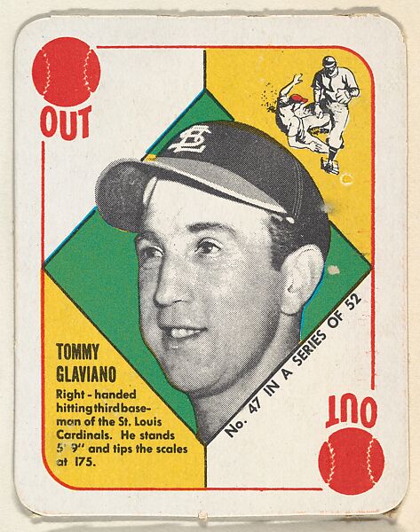 - Title: Card Number 47, Tommy Glaviano, 3rd Base, St. Louis Cardinals, from the Topps Red/ Blue Backs series (R414-5) issued by Topps Chewing Gum Company