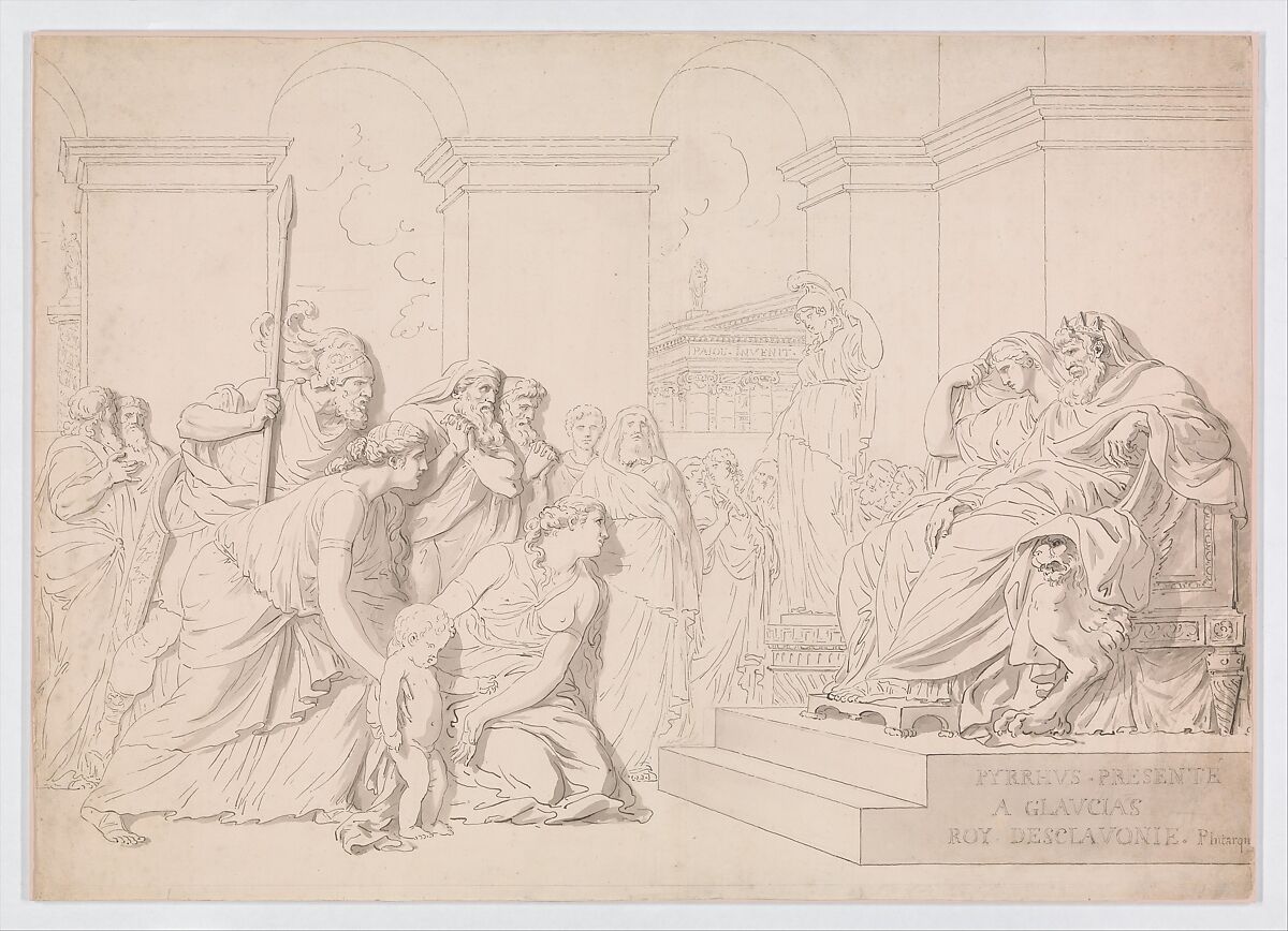 This drawing illustrates a scene from Plutarch’s Lives: the infant king Pyrrhus, after he is banished from his native Epirus, is presented to the Illyrian king Glaucias and his wife to request asylum. This large and fluidly worked sheet was included among the drawings Pajou exhibited in the Salon of 1759 and was part of the collection of his former teacher, the sculptor Jean-Baptiste Lemoyne the Younger (French, 1704–1778). The precisely delineated shadows evoke the shallow space of a relief sculpture, and in fact, this composition would go on to be realized in three dimensions, twice in plaster and once in leather.
