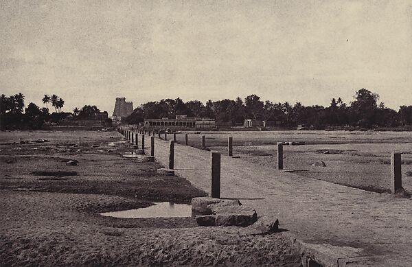 This work of art is currently on loan to the museum.For Hindus, a tirtha, literally a ford or a crossing place, is a sacred site that allows one to pass from worldly engagement to transcendence. In Tripe’s photograph the dramatically receding causeway leads the eye to the gateway around the Minakshi Sundareshvara Temple, dedicated to the god Shiva and his consort Minakshi. Shiva is said to have created the Vygay River, which, like most rivers in the far south of India, dries up during the hottest months of the year.