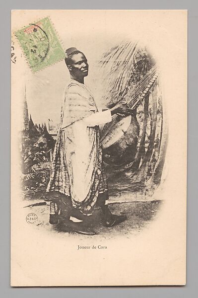 Traveling with their camera and a rolled backdrop, photographers, such as Hostalier, could reach a wider clientele across the region. In this carefully orchestrated mise-en-scène, a man holds a kora, a stringed instrument from West Africa, and stands in front of a painted backdrop of a Senegalese village hidden among palm trees. His position suggests movement, as if he were playing his instrument while walking by his village. The pose and prop identify him as a griot, or historian, the guardian of noble families’ histories and lineages. The composition’s theatricality, enhanced by the presence of the backdrop, tells us more about the mythical figure of the griot than the sitter’s own identity.