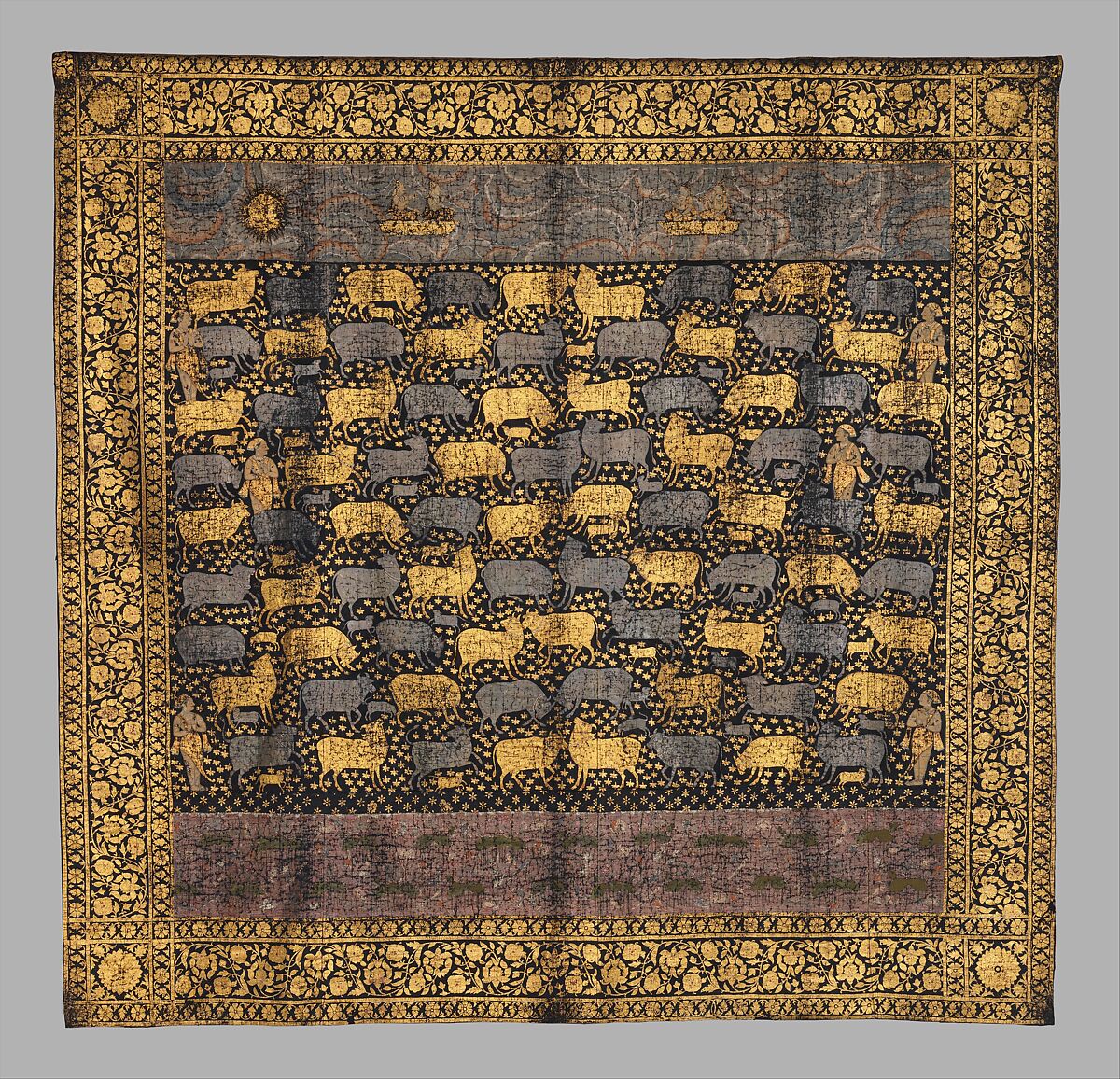 - 재료: 쪽빛 염색 면직물에 금박, 은박, 불투명 수채화로 착색 및 날염