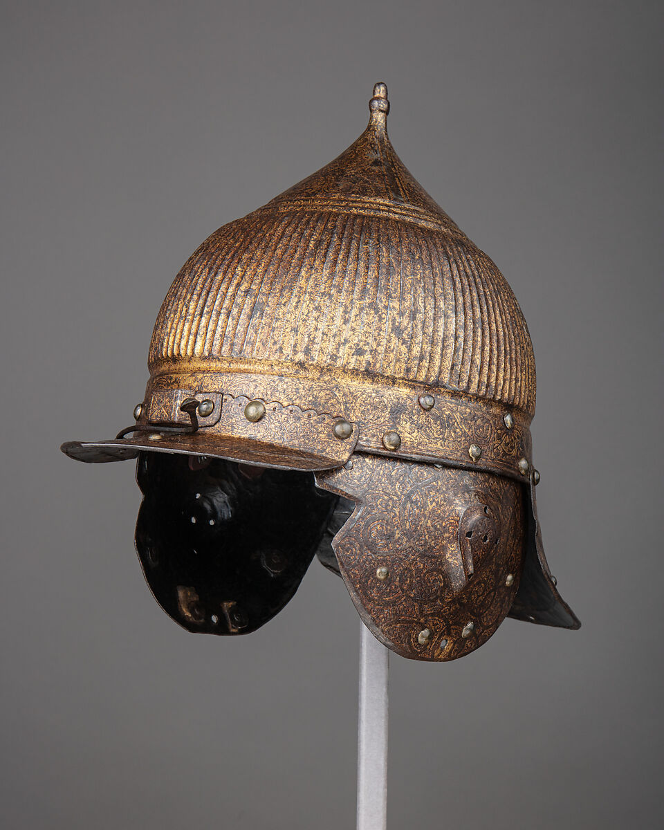 Made in Germany at a time of ongoing struggle with, and yet widespread fascination for, the Ottoman Empire, this horseman’s helmet is a singularly well-preserved example of a distinctive style of central European armor that was directly inspired by Islamic prototypes. Known as a Zischägge, it is formed and constructed in the Ottoman fashion and as such stands as a splendid counterpart to a fine Turkish-made example in the Metropolitan Museum’s collection (acc. no. 04.3.456a). Probably intended for export to Hungary, or an adjacent territory similarly in direct contact with the Ottomans, it is sturdily constructed of steel plates that have been skillfully etched and gilded overall with Moresque designs and scrolling foliage.