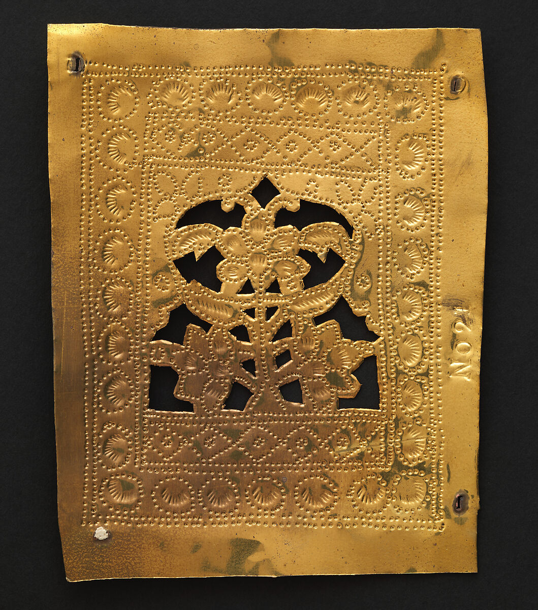 A key figure in the Aesthetic movement, New York-born artist Lockwood de Forest (1850–1932) was very inspired by Indian arts and crafts, and created the Ahmedabad Woodcarving Company in Gujarat, which exported many items to the United States. These cut and chased brass cutouts, designed by de Forest, were based on examples found in wood, plaster, and stone in Indian architecture. In his designs, they would have been used as ornament on architecture or furniture.
