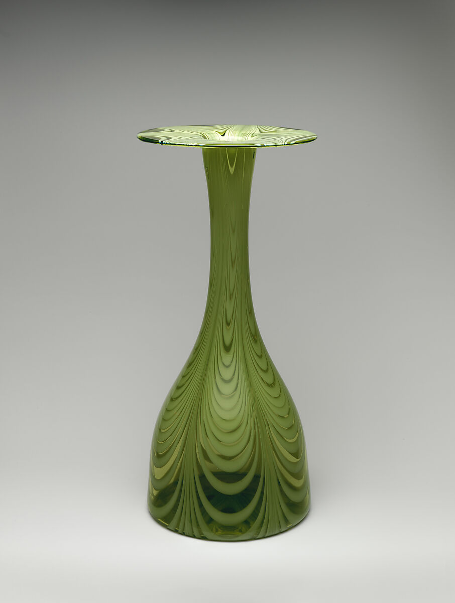 However, "quaint" hardly applies to this example, which shows Dresser’s taste for the techniques and properties of the medium in a different, very particular way: its elongated form and clean, uninterrupted outline is attainable thanks to the lack of any necessary joins in the blown, drawn glass; the graceful patterning in opaque green glass accentuates this quality, being not applied to the vase’s surface but rather fused within it and developed as the glassblower gave the vase its form. The vase is flawlessly executed, showcasing the great skill and craftsmanship of its maker at James Couper & Sons’ glassworks. The vase's regularity, which is quite unlike most other Clutha vases, finds its closest parallel in the crisp contour and ribbed decoration of the second, smaller, blown and molded Clutha vase in the Met's own holdings: 1991.20.2. More akin in outline to Dresser’s designs for metalwork of the 1880s, it is likely that this object, and less distinctively 1991.20.2, are early examples of Clutha designs, before Dresser developed the more popular, organic, consciously archaic and more art nouveau-like forms most typically associated with his Clutha glassware, characterized by the museum's other example, 1998.160.