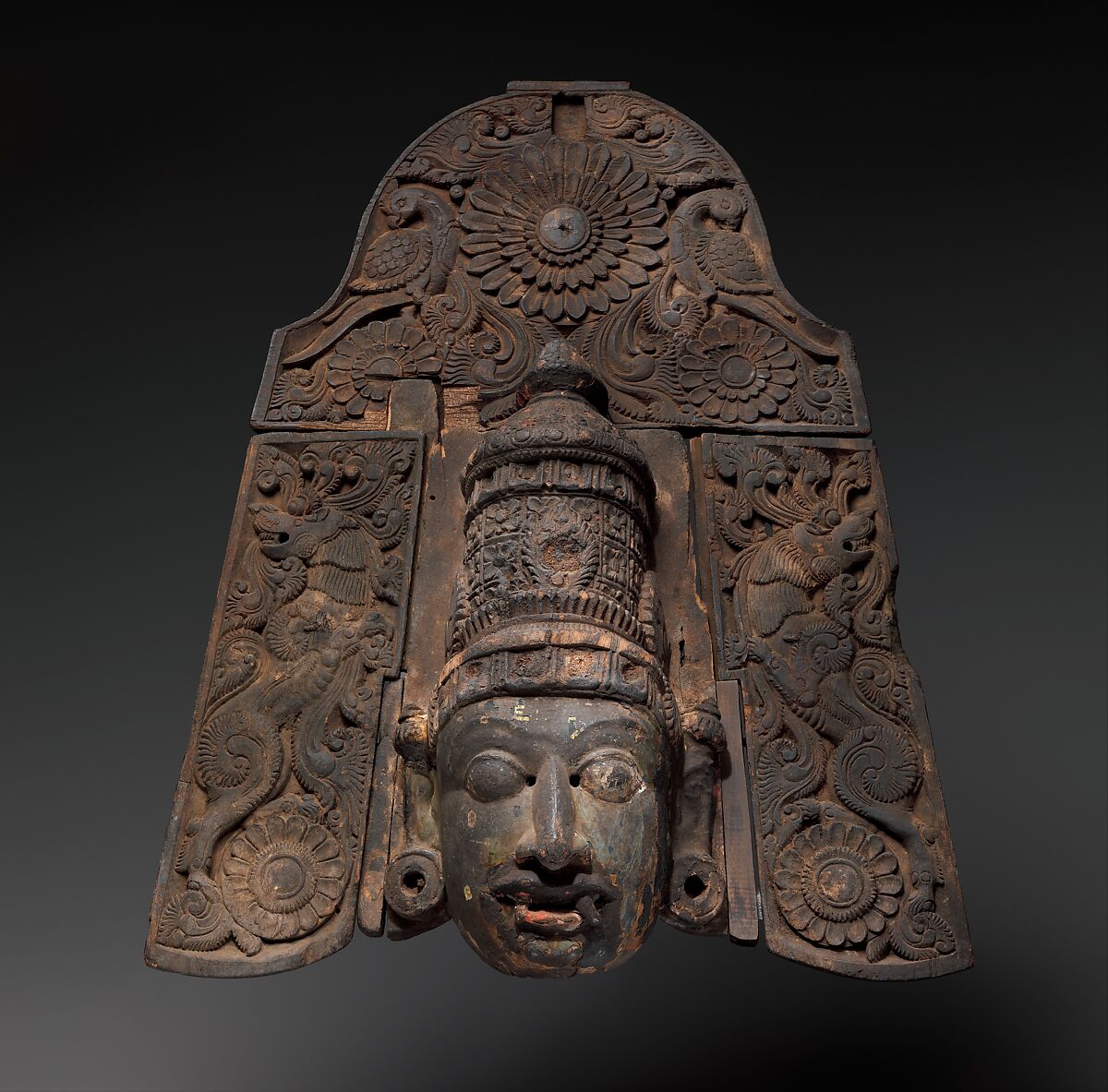 Only the two small fangs that protrude from Hiranyakashipu’s mouth indicate the demonic nature of this regally crowned character. In other respects he displays full kingly regalia, with a towering conical crown, while the winged panels framing his face are decorated with mythical leonine creatures (yali) and a lotus flower summit framed by parrots. The multiple layers of pigment on a cotton ground witness the mask’s repeated ritual cleansing and repainting before each performance.