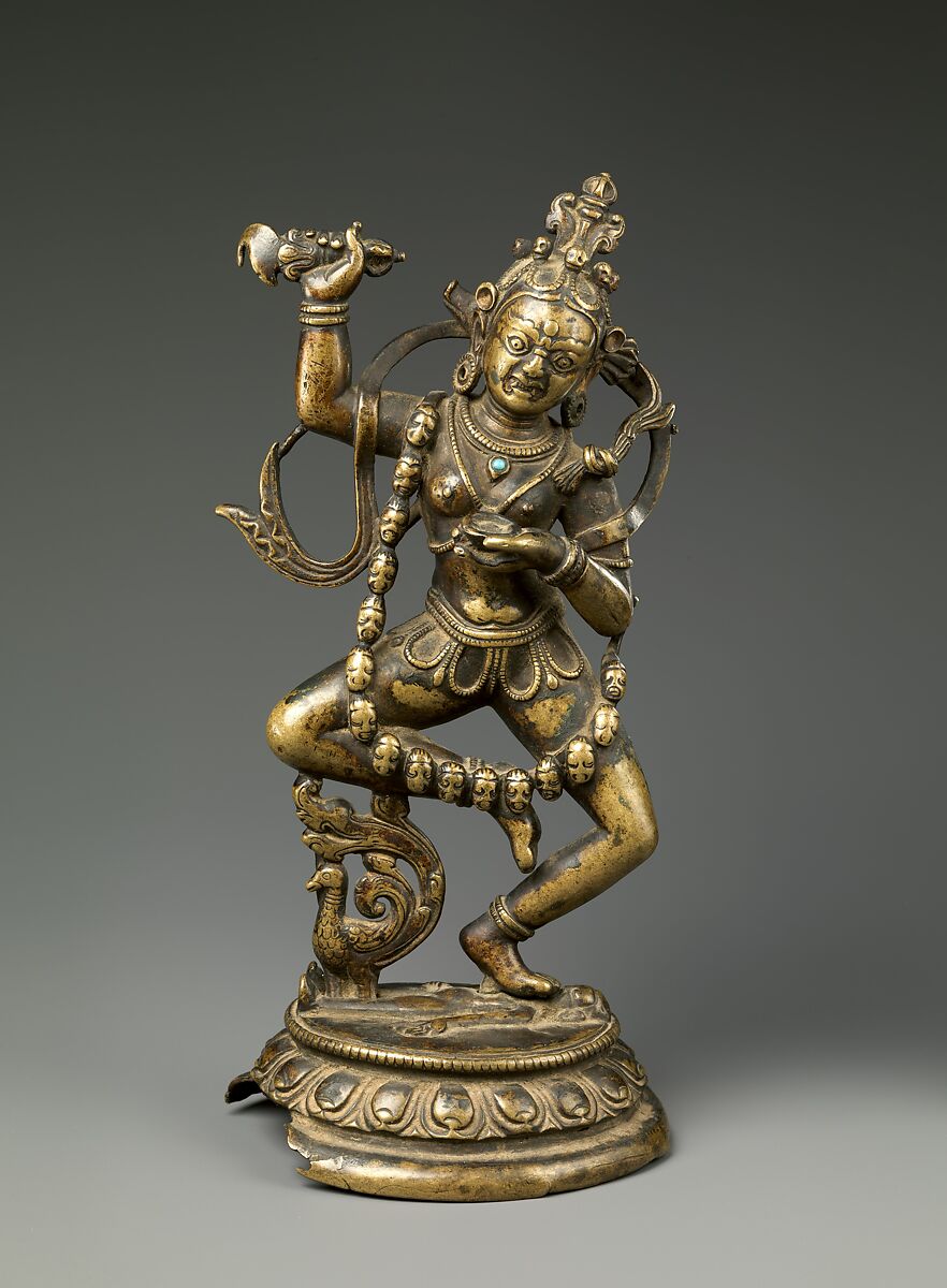 Vajravarahi derives from the boar-headed Hindu goddess Varahi, the female aspect of Vishnu’s boar avatar, Varaha. She reflects the incorporation of Hindu imagery into Vajrayana Buddhism. Here, the face of a sow projects from her head. Wearing a garland of severed heads, she dances on a corpse, wielding a chopper with a vajra (thunderbolt) finial, evoking the cutting away of illusions.