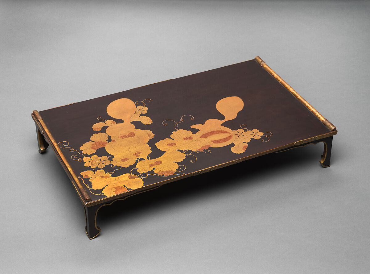 This writing table, which was probably originally made as a set with a matching writing box, is decorated with designs of melons and squirrels, auspicious symbols representing good fortune and fertility. This painterly subject originates from Chinese compositions depicting nature, including birds and flowers, grasses, vegetables, and insects, popular in the arts of the Ming dynasty. Painters in Japan during the Muromachi period (1392–1573) incorporated these subjects into their repertory. The maki-e artist depicted the squirrels in a dynamic, playful composition, while some of the leaves are designed as if partially eaten by insects. The application of the flat maki-e and the e-nashiji (“pearskin picture”) sprinkling follows the Momoyama-period traditions (1573–1615) of Kōdaiji lacquers.