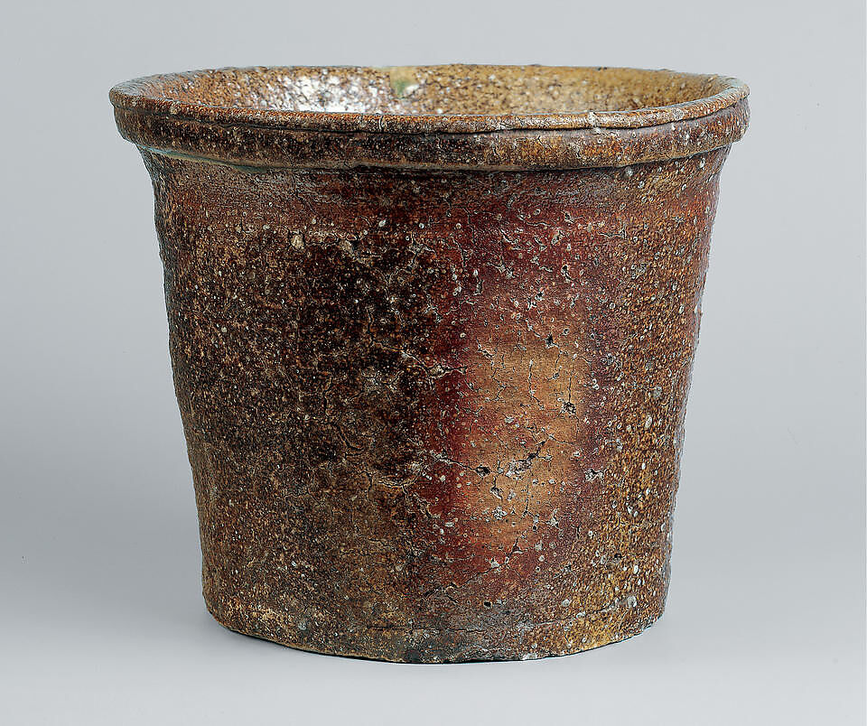 During the sixteenth century, when the foundations of the Japanese-style tea culture (wabicha) were formed, tea master Takeno Jōō began using simple, rough Shigaraki ware in the tea room. One of the vessels he adopted as a freshwater jar was a Shigaraki container known as an onioke (devil’s bucket) and thought to have been used in the Ōmi area to process hemp or ramie stalks into thread. When Shigaraki clay is fired without glaze, it turns a range of shades, from golden-orange to ruddy brown, its tawny surface flecked with white grains of feldspar. Wood ash melting onto the vessels during wood-firing could create irregular patches of greenish-blue natural glaze. Western potters, such as Paul Chaleff, were inspired by the seemingly random effects of the wood-fired kiln.
