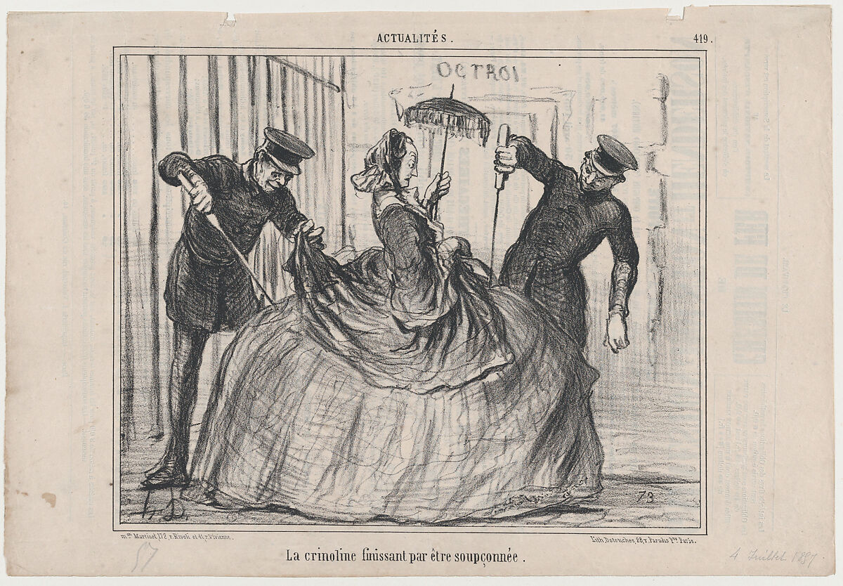 - Title: La crinoline finissant par être soupçonnée, from Actualités, published in Le Charivari, July 4, 1857