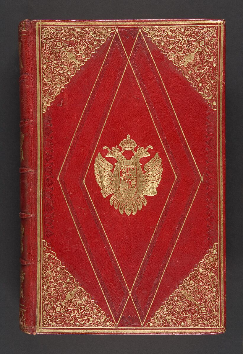 Contemporary red morocco gold- and blind-tolled binding with large corners with a floral motif and central armorial stamps of Francis I, Emperor of Austria (1768-1835) framed by a double-diamond motif; blue silk doublures. This presentation binding was bound by Lodigiani of Milan (1777-1843), the greatest Italian bookbinder of his time. Signed at foot of spine "Lodisiana (six)/Rel."