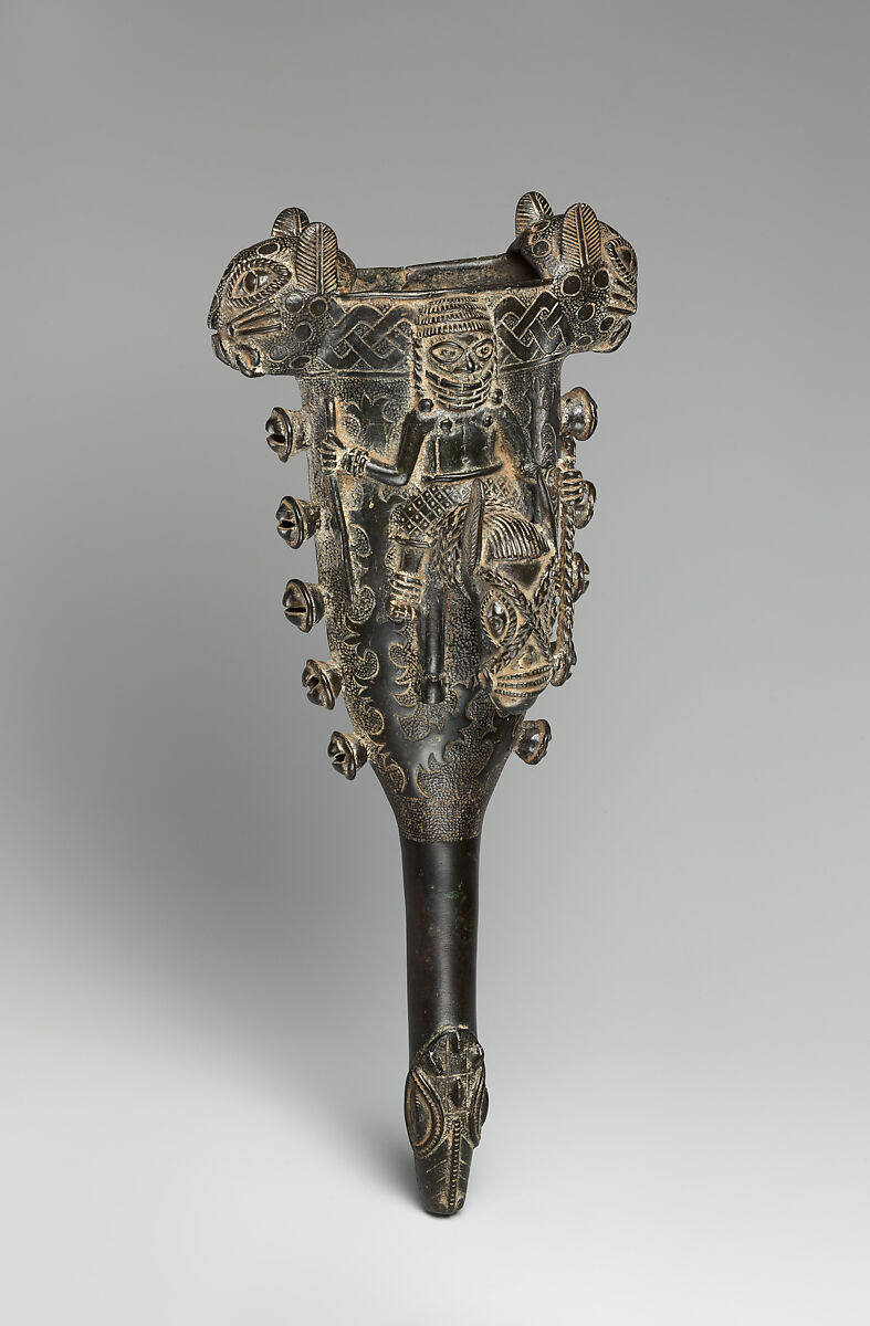 Elaborate hand bells like this one are extremely rare, especially with equestrian depictions symbolizing male achievement. Such a bell was probably made for a lesser member of the royal entourage as it is a single, not double bell and is made of brass not ivory. The bell is clapperless so its ring (pitch g1 –g above middle c) is produced by striking its outer surface when it is used at annual courtly ceremonial functions to assist in repelling evil spirits. The unusually elaborate decoration of the bell and handle includes small crotal bells vertically aligned along the edges border, a leopard head (symbol of royal power) flanking each side of the oval mouth, and an interlaced pattern filling band at lip. The front is dominated by a horse and rider in relief-his left hand holding a staff, his right holding the reigns, the horse’s neck and head emerge from the bell’s surface three dimensionally. The back features in relief a crocodile, a symbol of the Oba and his connection to Olokun (sea god) a theme repeated at the end of the bell’s handle. The bell’s surface treatment sets the figures against a stippled background with a vine-like meanders and on the back a floral (tulip) pattern.