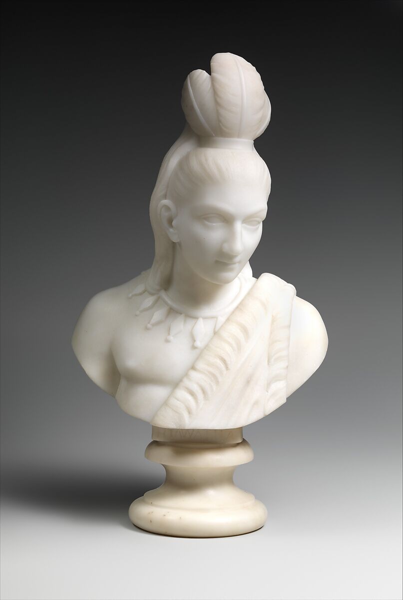Like many American sculptors of the nineteenth century, Lewis, an artist of African American and Native American (Anishinaabe/Ojibwe) descent, worked in Rome, Italy. Her multiracial identity and gender were formative in her selection of subjects. Between 1866 and 1872, she completed a series of marble sculptures on the popular theme of Hiawatha and Minnehaha, drawn from Henry Wadsworth Longfellow’s epic poem The Song of Hiawatha (1855). This cabinet-sized bust and its pendant (2015.287.2) represent the star-crossed lovers from once-warring nations (Anishinaabe and Dakota), and blend an idealized treatment of form with Native American dress and accessories.
