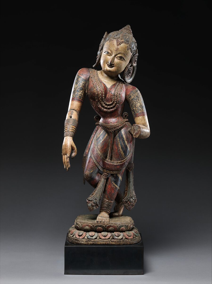 Polychromed wood sculpture from at least the tenth century survives in Nepal, in the form of both independent sculptures and architectural elements. This dancer, likely one of a pair, is a form of a Buddhist savior, a counterpart to such popular bodhisattvas as Avalokiteshvara in the form of Cintamani Lokeshvara, the wish-fulfilling jewel bearer. This goddess gestures with her lower hand, evoking her boon-granting power.