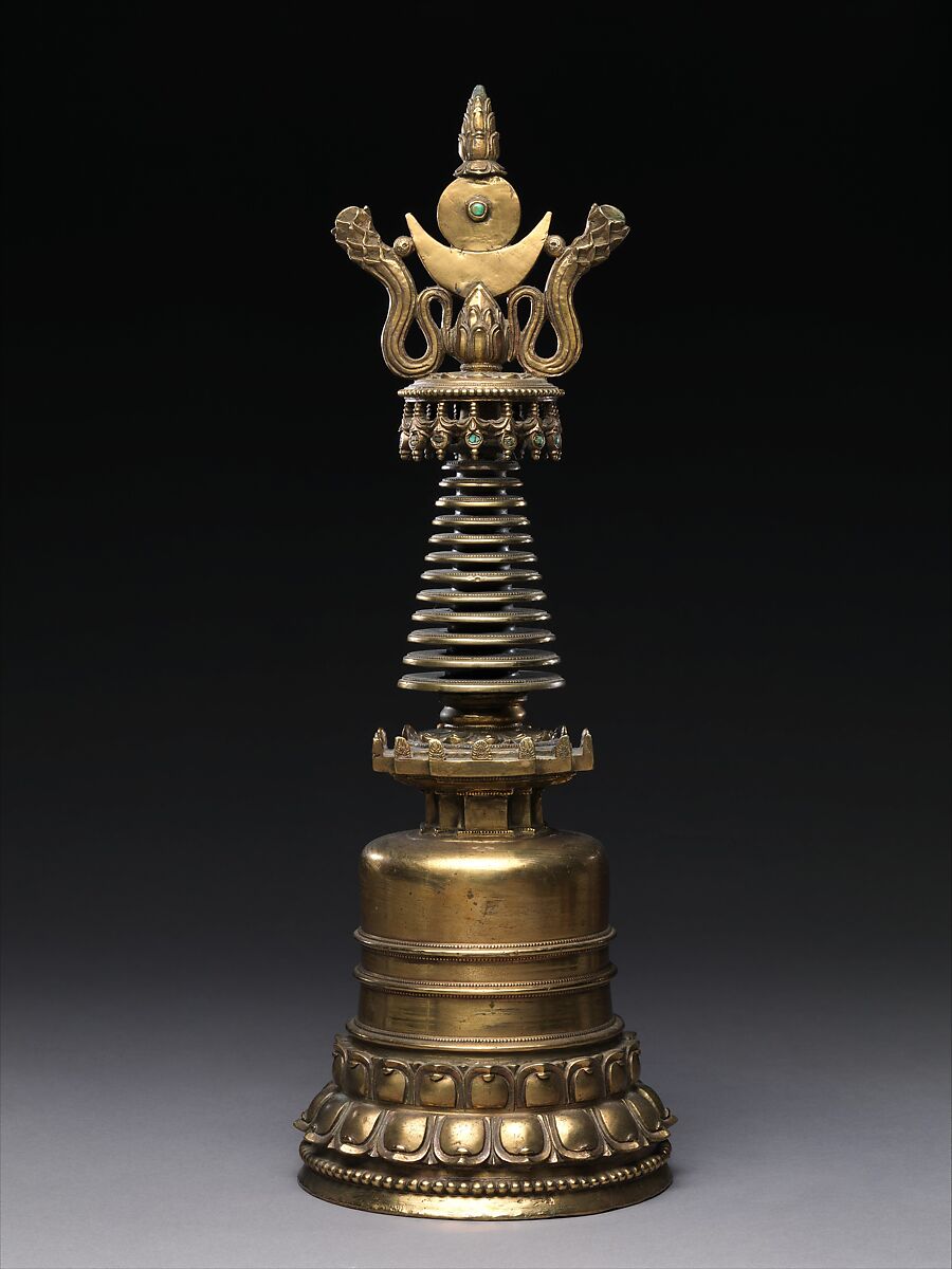 The stupa (Tibetan: chorten) is the most ancient form of Buddhist art, symbolizing the monumental funerary mounds of ancient India that were appropriated into Buddhism as depositories for Buddha relics. Over time they assumed many forms, including scaled-down versions in metal, which serve the same function of housing holy relics, but whose higher purpose in a Buddhist monastery is to evoke the presence of the Buddha and his teachings.