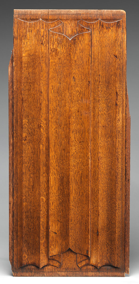 These decorative oak panels exemplify the designs of A.W.N Pugin, who was the leading exponent of the Gothic Revival style in England. Pugin’s work is central to the transformation in British design that began in the mid-nineteenth century. He admired what he saw as the honesty and purity of medieval art, and deplored the meaningless repetition of historical motifs. Pugin coined the phrase “Brumagen Gothic,” referring to “those inexhaustible mines of bad taste, Birmingham.”