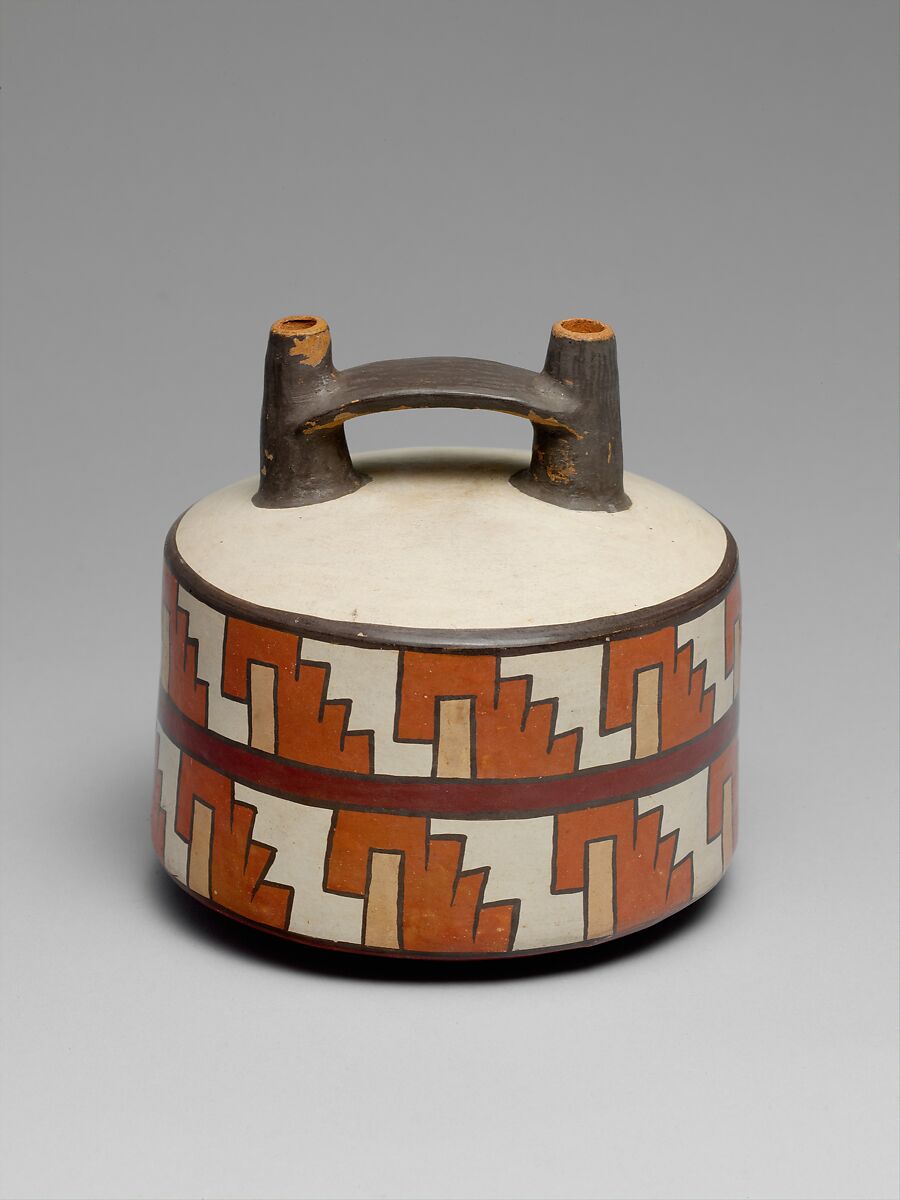 Nazca potters were the first to master the technique of polychrome slip painting. Slips were made of clay particles and mineral pigments suspended in water; they were applied onto the surface of the vessels before the firing process, when the clay was still moist. Whereas solid areas of colored slip may have been applied with smooth cotton fiber, intricate designs and delicate outlines were made with fine brushes. Nazca geometric decorative designs include steps, step frets, stepped pyramids, checkerboards, stars, and zigzag lines, among others. These two vessels are decorated with two rows of stylized step motifs. Kaolin was used as a white pigment; reds and yellows were obtained with iron oxides and black areas were probably made with manganese minerals. The surface of the vessels was burnished with a smooth stone or bone before the clay was completely dry. Repeated step motifs were used in the decoration of Andean ceramics from the Cupisnique period (1800–400 B.C.) and were interpreted as stylized representations of mountains, temples, or thrones.