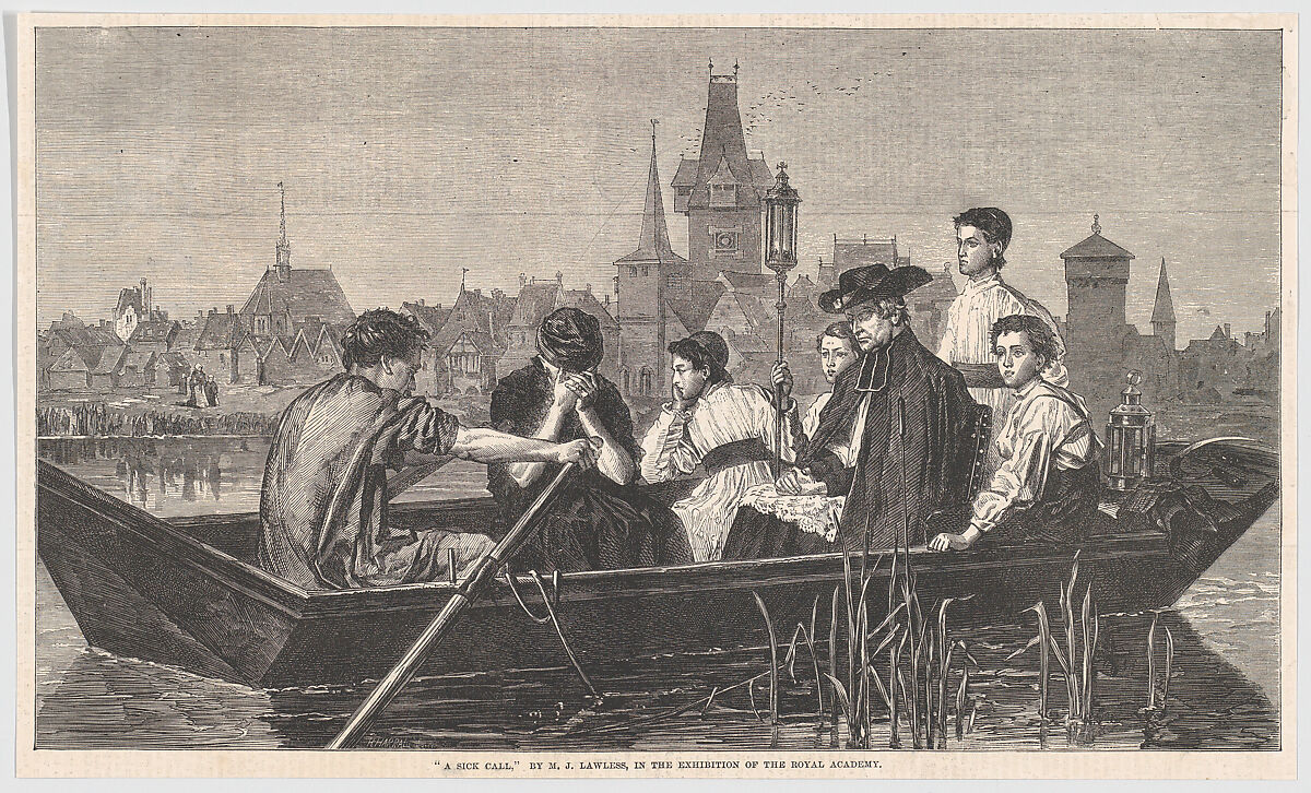 A priest is rowed in a boat, accompanied by altar boys as a woman weeps next to the oarsman. The architecture indicates a setting in Belgium or northern Germany. Lawless was born in Dublin to a prosperous Roman Catholic family, traveled in France and the Low Countries, and was pursuing a promising London career when his life was cut short by tuberculosis in 1864. That makes the present subject a poignant one, since the prognosis does not seem hopeful for the patient to whose bed the religious figures are travelling–an unhappy outcome indicated by a dimly lit lamp, broken reed in the foreground, and sickle that rest on the stern. The full title of Lawless's related painting of 1863, now National Gallery of Ireland, Dublin, is, "The Sick Call: "Is any man sick among you? Let him bring in the priest of the Church, and let them pray over him, anointing him with oil in the Name of the Lord."