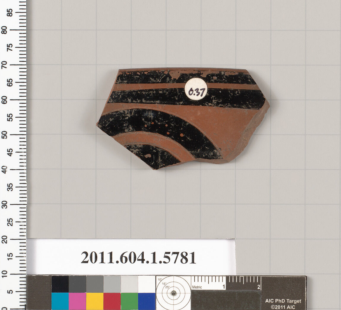 - Title: Terracotta rim fragment of a kylix: eye-cup (drinking cup)
