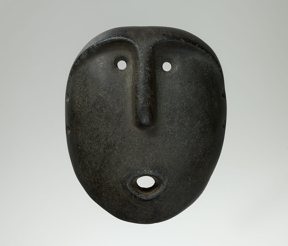 This stone mask features an anthropomorphic face with pronounced brow ridge, angular nose, and drilled perforations with raised carved ridges indicating the eyes and mouth. Additional drill holes line the outer edge of the mask, presumably to affix it with fibers to an armature. The mask was most likely attached to a funerary bundle.