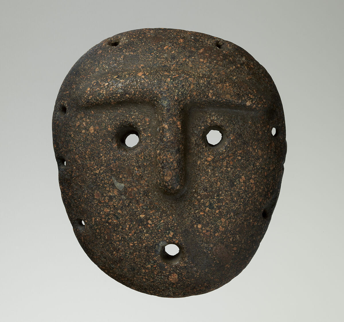 This stone mask features an anthropomorphic face with pronounced brow ridge, angular nose, and drilled perforations with raised carved ridges indicating the eyes and mouth. Additional drill holes line the outer edge of the mask, presumably to affix it with fibers to an armature. The mask was most likely attached to a funerary bundle.