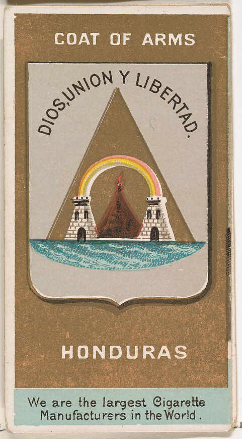 Trade cards from the "Rulers, Flags, and Coats of Arms" series (N126-2), issued in 1888 by W. Duke, Sons & Co. There are two types of cards from the series. The first type is made of thick stock and does not fold. This variation promotes Honest Long Cut tobacco. The second type, pictured here, is printed on thinner stock and is meant to be folded in three parts. This variation promotes Duke's Cigarettes, Cameo, and Turkish Cross-Cut brands.