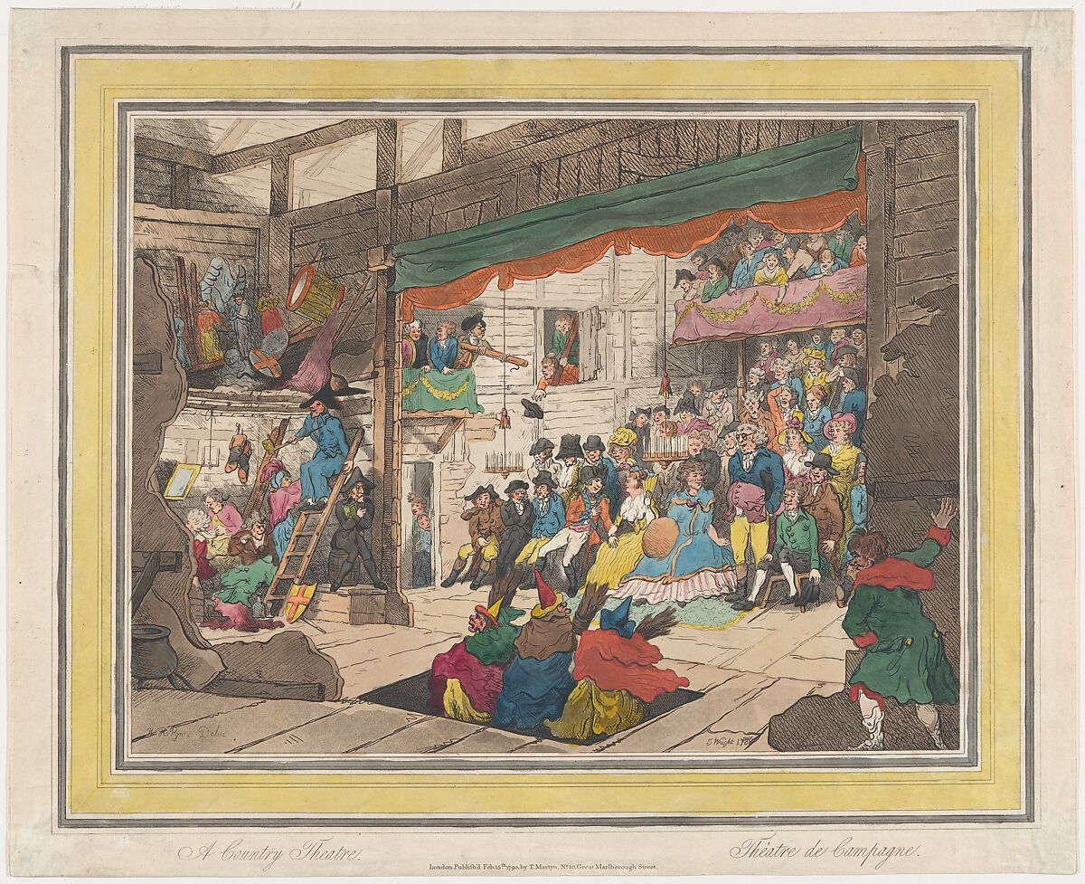 Shakespeare's wide popularity around 1790 is demonstrated by this satire. A provincial audience crowds a barn-like theater to attend a performance of Macbeth. We view the scene from backstage as the three witches emerge from a trap door. At left, unseen by the audience, a prompter sits on a barrel as players mend a costume, smoke, and having their hair dressed. At right, peeking around a flat, a booted and cloaked figure who may be Macbeth, waits to come on.