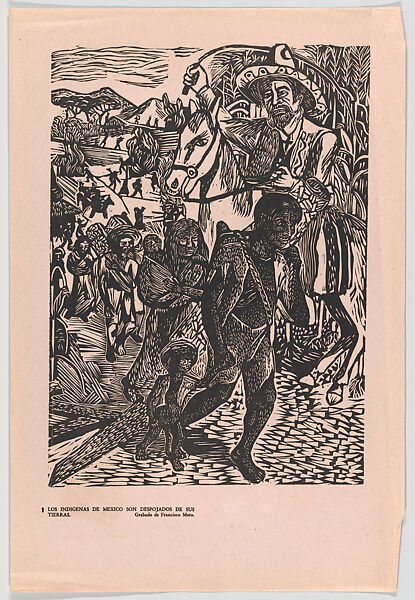 This is the first print from a portfolio comprising eighty-five linocuts published in 1947 by the Taller de Gráfica Popular (TGP; Workshop of Popular Graphic Art) in Mexico City. Created by sixteen artists, the images represent notable individuals and events leading up to the 1910 revolution, the armed conflict, and additional events through the end of World War II. Depicted here are Indigenous communities being driven from the farming land they owned and worked, one of the injustices that sparked the revolution.