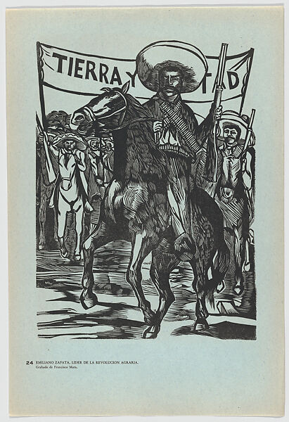 Mora contributed this portrait of Zapata, a leader of the Mexican Revolution of 1910–20, to a portfolio commemorating that historic struggle, published by the print collective Taller de Gráfica Popular. The workshop built upon an important tradition of revolutionary printmaking in Mexico and aimed to further the progressive and democratic interests of Mexican people in all of their work. Mora and his fellow participants believed that the social purpose of an artwork was inseparable from its quality. In this print, Zapata, who fought to redistribute land to the peasants in his state of Morelos, appears on horseback leading the Liberation Army of the South, whose members carry a partially obscured banner that reads "tierra y la libertad" (land and freedom).