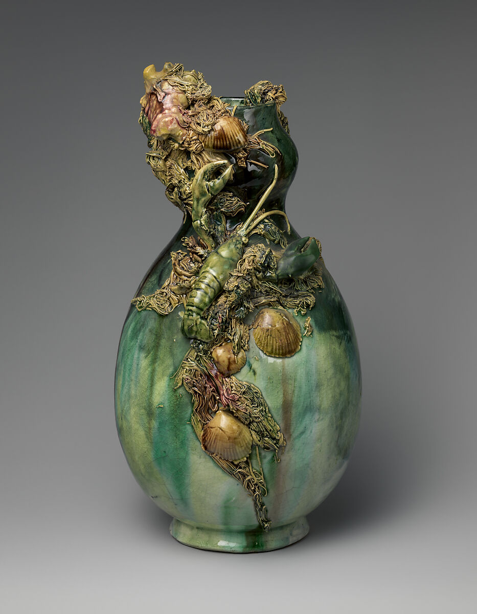 Many of the Cincinnati potters and decorators of the late 1870s and early 1880s were skilled practitioners of the French technique of barbotine, or painting with colored slips under the glaze. Another aspect of barbotine decoration was introducing applied elements of flowers, or in this exceptional example, marine life. Thomas J. Wheatley demonstrated an affinity for Japanese art that aligned with French ceramics in the 1880s. Known primarily for his barbotine, this vase and a small numbers in this mode, reflect the influence of Asia in their motifs and inspiration, as well as demonstrating his reverence for the French sixteenth-century pottery of Bernard Palissy. Palissy, a prominent figure in all histories of ceramics, is often considered the father of modern ceramic art. Wheatley’s distinctive vase drew upon the Renaissance master’s work in portraying sea life realistically and in high relief. It literally pulsates with life as the fish, crustacean, and seaweed surge around the gourd-shaped vase, and boldly extend beyond the vase’s lip.