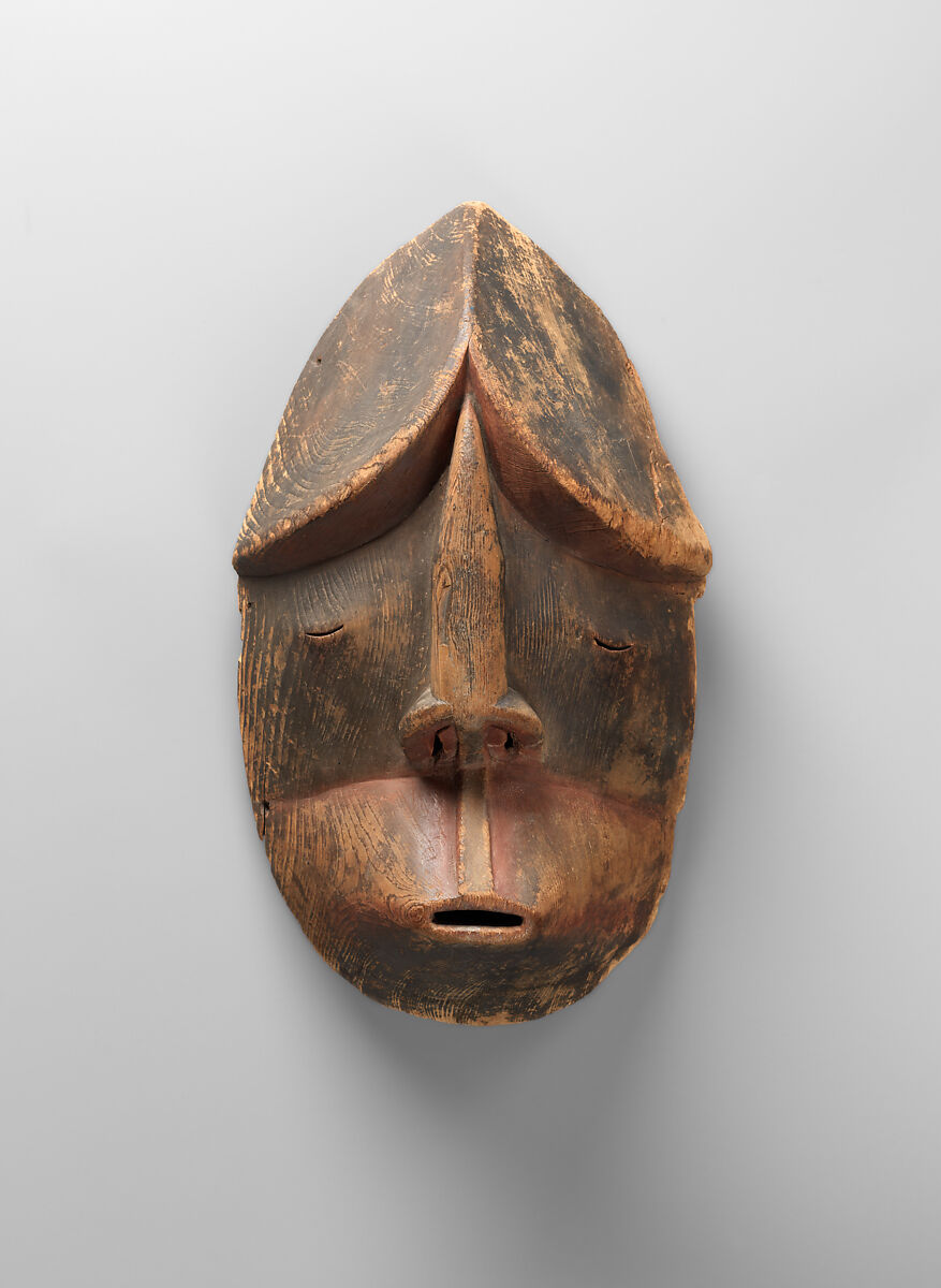 The peoples of the Arctic region use music and performance to invoke the spirit realm. According to native Alaskan beliefs, spirits communicate with people through whistling: these masks may be the faces of such supernatural beings, as they appear to whistle at their beholders. The formal resemblance between the pair, including the prominent noses, minimal eyes, and pointed head decorations, may mark them as specific, linked characters in a myth. Early twentieth-century modernist artists and collectors were drawn to the bold simplicity of such works.