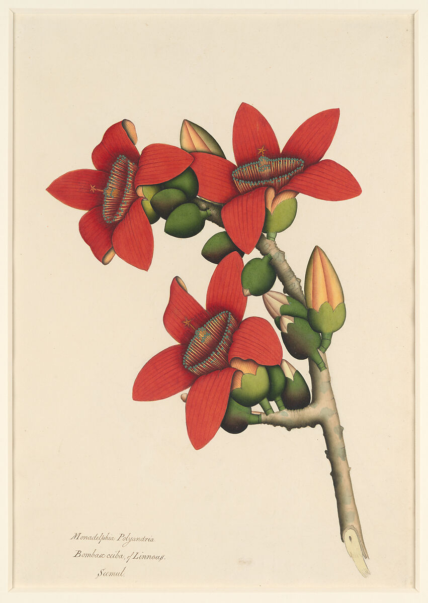 This vividly colored drawing, made in Calcutta by an Indian artist, belonged to Edward Smith Stanley, 13th Earl of Derby (1772–1851). It was part of a collection of horticultural books, prints, and drawings kept at Knowsley Hall, his family's estate in Merseyside. The English inscription on the lower left indicates the full name of the plant according to the Linnaean system (Monadelphia Polyandra Bombax ceiba) as well as its common name in India, Seemal (spelled "Seemul"). In northern India, the Seemal tree blooms with bright orange flowers from February to April. When its fruits split open, silky fronds of cotton waft down to the ground, a common sight in the countryside.
