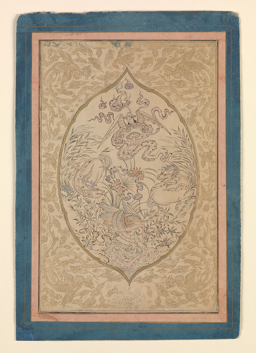 This image of an angel, two fantastic beasts, and a goose riding a tortoise is a copy of an early 15th-century Persian drawing in an album of similar material, now kept in the Staatsbibliothek in Berlin. Signed by Mu‘in Musavvir, a leading 17th-century Safavid artist, the work is dated 1088/1677. The work suggests that Mu‘in had recently seen the album for the first time, since from around 1675 until the end of his career in the late 17th century Mu‘in drew many Chinese-style animals in landscape. While most of those images conform to the artist’s more calligraphic style of draftsmanship, the introduction of this type of content was new and may be explained by the impact of the album drawings and paintings on his work.