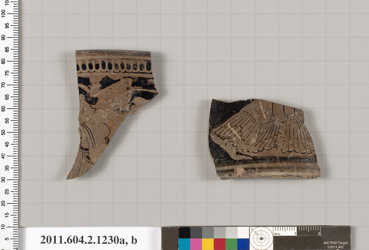 At the rim, an egg pattern, below, back of the head, part of the neck, and upper torso of a draped woman to left; the second fragment shows the lower drapery and foot of a woman to right, wearing a chiton and himation