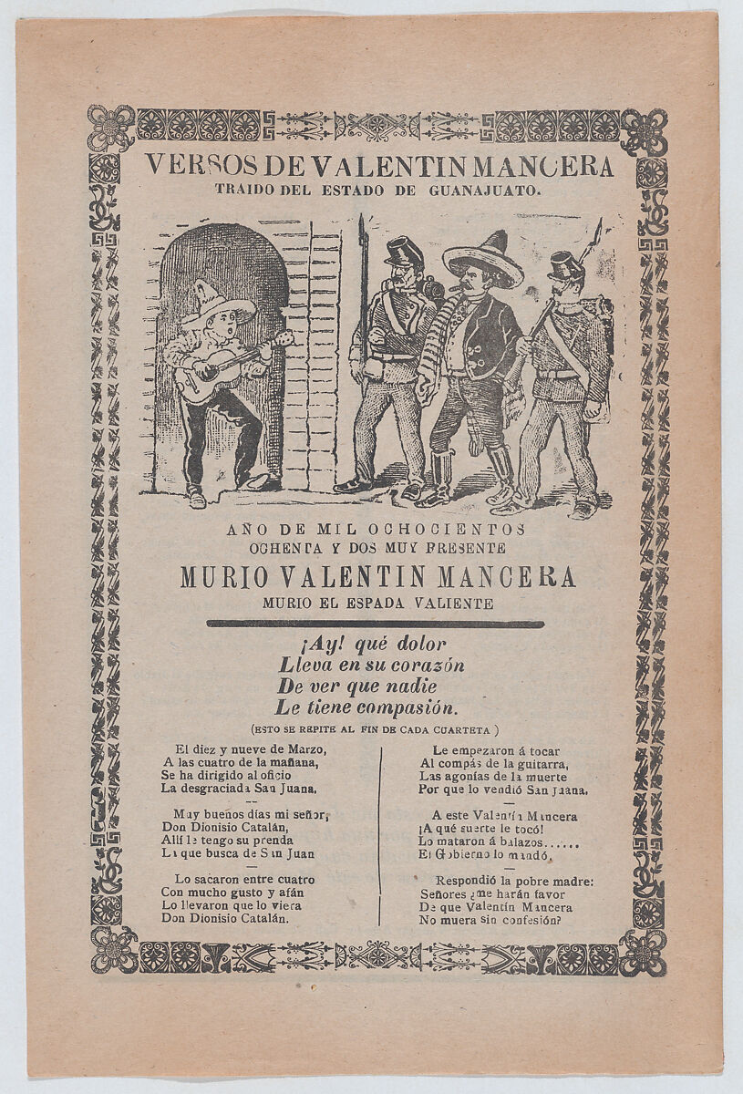 - Title: Broadsheet relating to the capture of Valentin Mancera who is shown playing the guitar and being cornered by men in uniforms carrying weapons