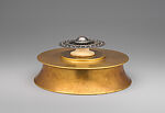 Although trained in painting and sculpting, the multi-talented artist Marie Zimmermann was primarily a metalworker, who liked to say that she made "everything from tiaras to tombstones." This striking covered dish—at once simple and opulent—represents a type of vessel favored by the artist, that is, a shape reproduced in different iterations to achieve very different effects. Several dishes of this same profile are known, but due to their varied materials and embellishments, they look completely different. The luscious gilding on the present covered dish is smartly offset by an elaborate silver filigree disc that serves as a finial. Conjuring a lacy silver hubcap, it is one of a wide range of "found" objects that Zimmermann incorporated into her work