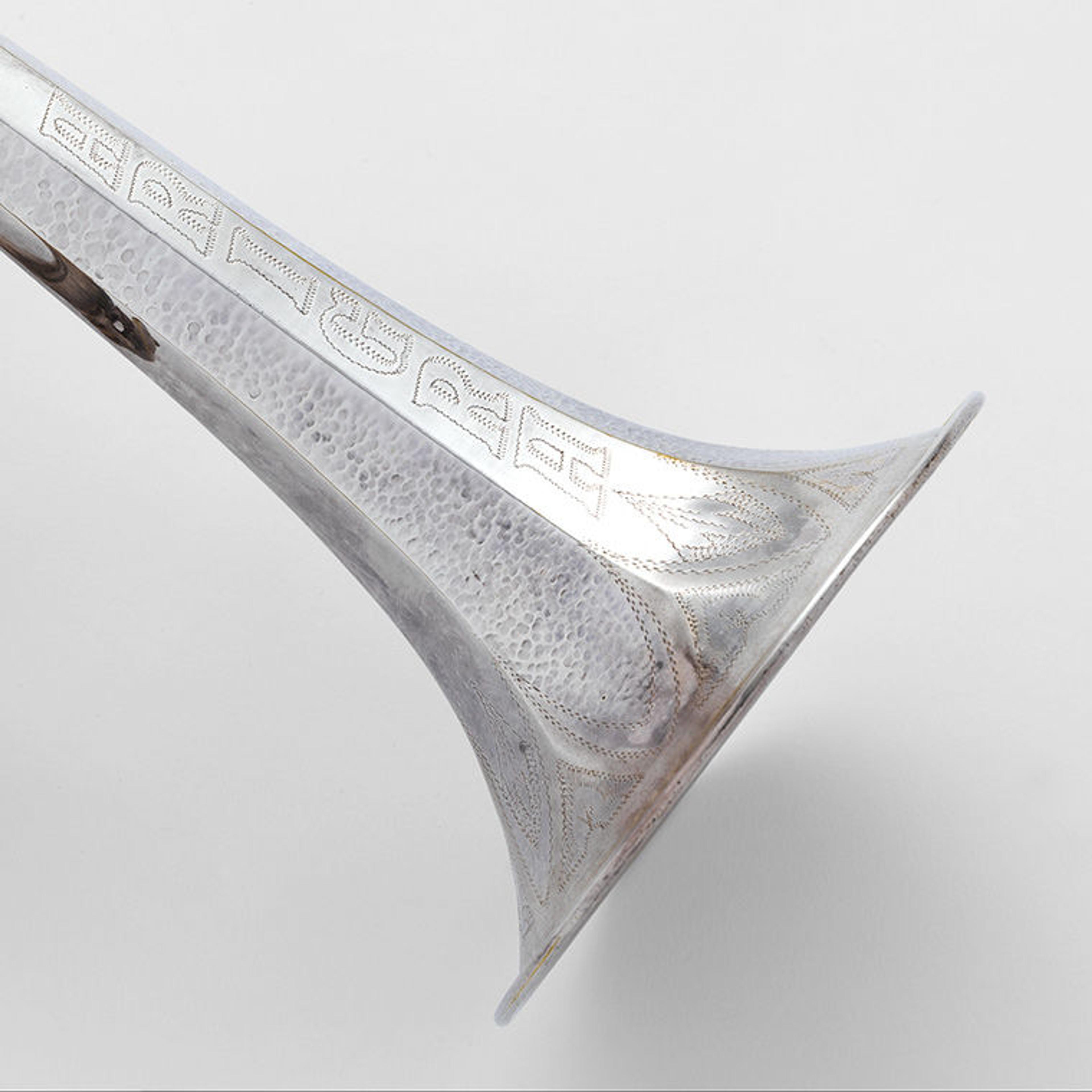 The streamlined and minimalistic form of this trumpet presents a strong American art deco aesthetic and captures the visual and musical style of the Jaz Age. Particuarly notable are elements such as its streamlined water keys, valve casings and touches, finger hook and braces. The instrument displays many decorative surface finishing techniques including hammering/planishing, mirror burnishing and sandblasting to produce a matte finish. The bell is rocker-engraved with stylized geometric motifs and a depiction of pan playing his pipes.