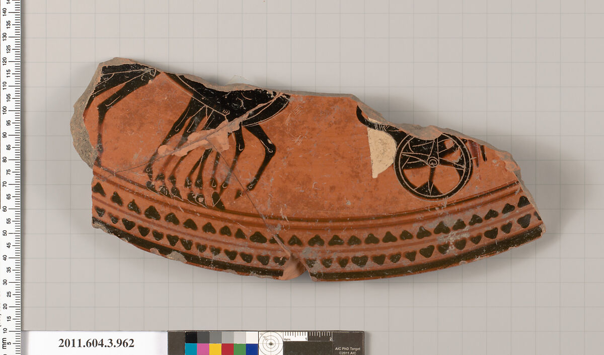Parts of two horses to right; part of the car and wheel of a chariot to right, with the lower drapery of the charioteer and tails of two horses; on the overhang of the rim, ivy, framed at the top by two black glazed lines, and at the bottom, by a thick band of black glaze; the resting surface of the lid is unglazed; the underside of the lid is glazed