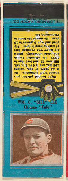 - Title: Wm. C. "Bill" Lee, Chicago Cubs, from the Baseball Players Match Cover design series (U1) issued by Diamond Match Company