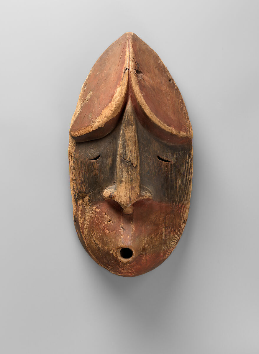 The peoples of the Arctic region use music and performance to invoke the spirit realm. According to native Alaskan beliefs, spirits communicate with people through whistling: these masks may be the faces of such supernatural beings, as they appear to whistle at their beholders. The formal resemblance between the pair, including the prominent noses, minimal eyes, and pointed head decorations, may mark them as specific, linked characters in a myth. Early twentieth-century modernist artists and collectors were drawn to the bold simplicity of such works.
