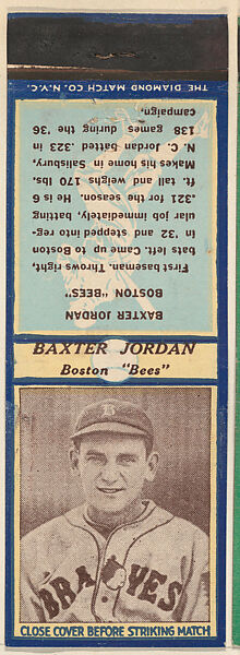 - Title: Baxter Jordan, Boston Bees, from the Baseball Players Match Cover design series (U4) issued by Diamond Match Company