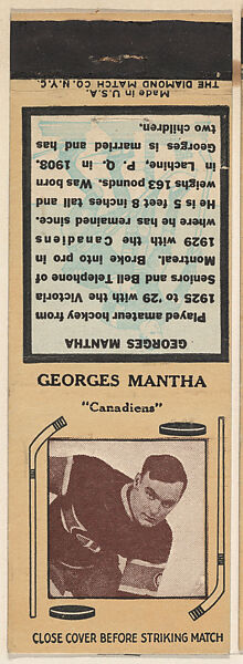 - Title: Georges Mantha, Canadiens, from Yellow/Tan Hockey Players Match Cover design series (U10) issued by Diamond Match Company