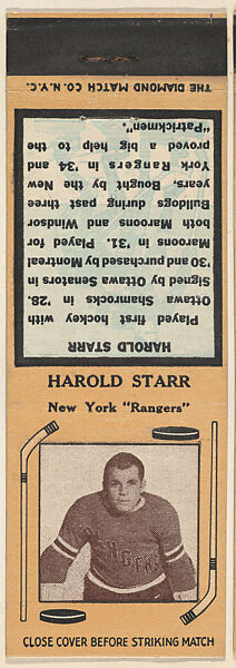 - Title: Harold Starr, New York Rangers, from Yellow/Tan Hockey Players Match Cover design series (U10) issued by Diamond Match Company