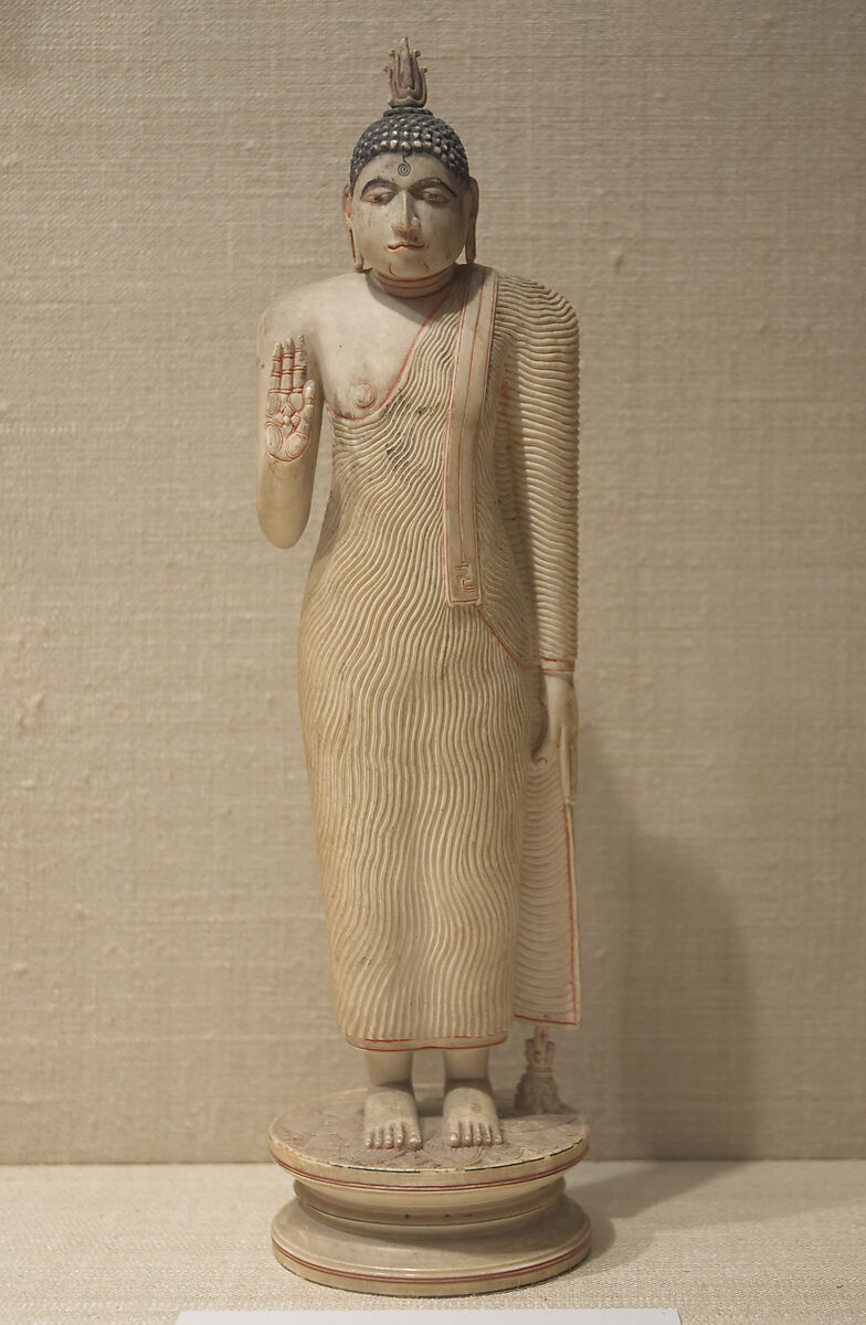 The Buddha raises his right hand in abhaya mudra, extending compassionate protection to devotees. Ivory was a favored material for Buddhist imagery in Sri Lanka.